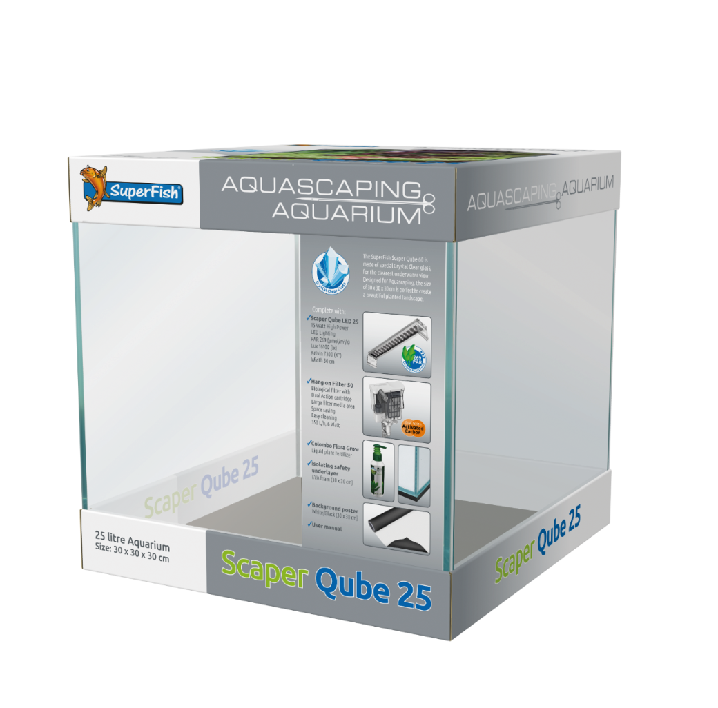The Superfish Scaper Qube 25 is a 25-litre nano aquarium designed for aquascaping enthusiasts. Crafted from ultra-clear glass, it offers a crystal-clear view of your aquatic landscape. The cube-shaped tank (30 x 30 x 30 cm) comes equipped with a 15W LED light (PAR 269) and a 6W Hang-on Filter 50, ensuring optimal conditions for plant growth and water clarity. Additional features include a black/white reversible background, an EVA foam underlay for stability, and Colombo Flora Grow fertiliser to support healthy plant development.